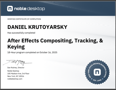 Developed advanced skills in Adobe After Effects with a focus on compositing, motion tracking, and keying techniques. Applied industry-standard workflows to integrate visual elements into cohesive compositions.