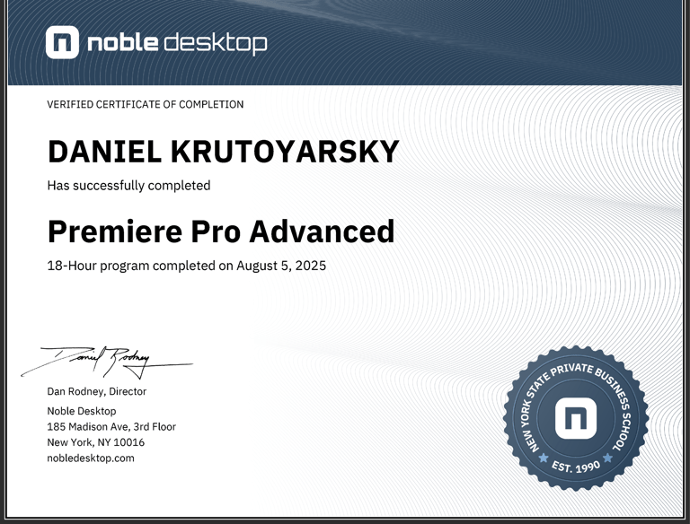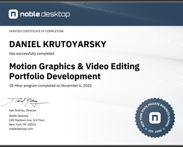 Gained hands-on experience in video editing and motion graphics fundamentals, including editing workflows, animation principles, and asset organization. Developed portfolio-ready projects demonstrating both creative and technical growth.