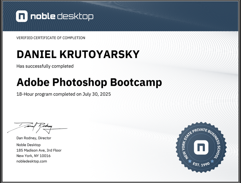 Built strong foundations in photo retouching, color correction, compositing, and graphic design. Strengthened proficiency in layers, masks, filters, and image optimization for both digital and print media.